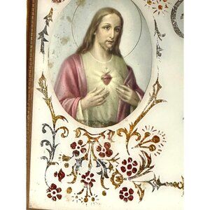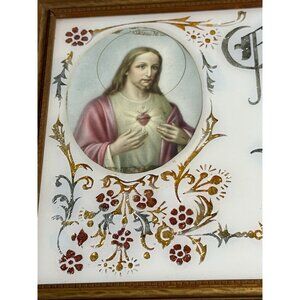Reverse Foil Art Glass Framed Religious Bless Our House Sacred Heart of Jesus