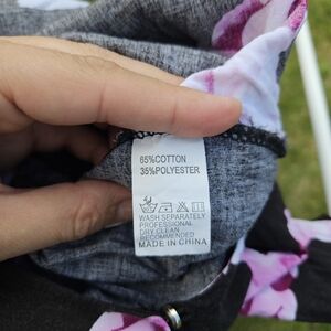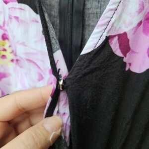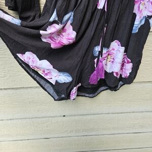 Black long sleeve romper with large purple and pink flowers. Surplice neckline with modesty snap. Has ties at the waist. Zips up the back.