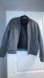 Stylish gray cotton bomber jacket with black quilted interior. Reservable for two looks and uses! Features zippered pockets and ribbed cuffs.