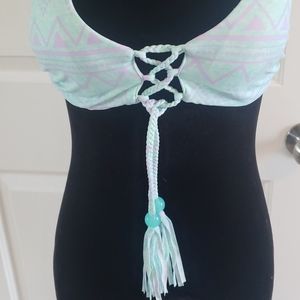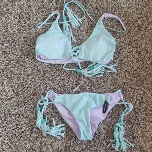 Pastel green and purple bikini. Top and bottom are both reversible. Adjustable ties on the top and bottom. Only the bottoms have a tag size XS, the top is a size Small (no tag). Great condition never worn.