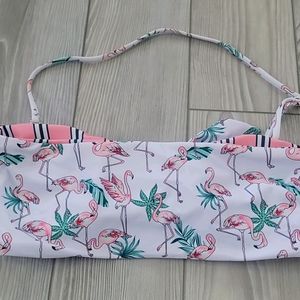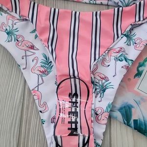 Reversible Bikini. NWT. 2-Piece. Fun flamingos on one side, striped on the other. Not see-thru. Bandeau top has removable strap. Super cute, but did not fit me. Arrived right before vacation, never returned it. Both are sized M.