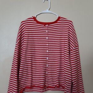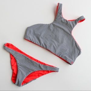 Hot pink reversible bikini with pinstripe pattern on opposite side. Razorback style top. Low-rose bottoms. Slight cheeky fit. No padding, no cups.