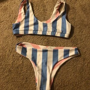 Adorable reversible pink&white stripe or blue&white striped. Size M, excellent condition. Only worn once. Not flaws in fabric. It can also fit as a small, it’s pretty stretchy.