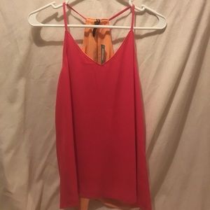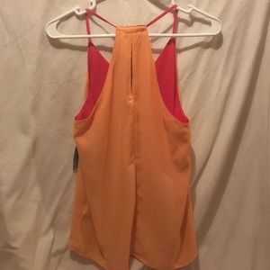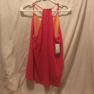 Flowy reversible top in a soft peachy orange and bright fuchsia. The size is an extra small, but fits more like a small. New with tags, in great condition! Super cute next to denim! 100% polyester.