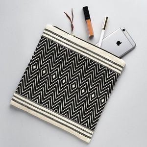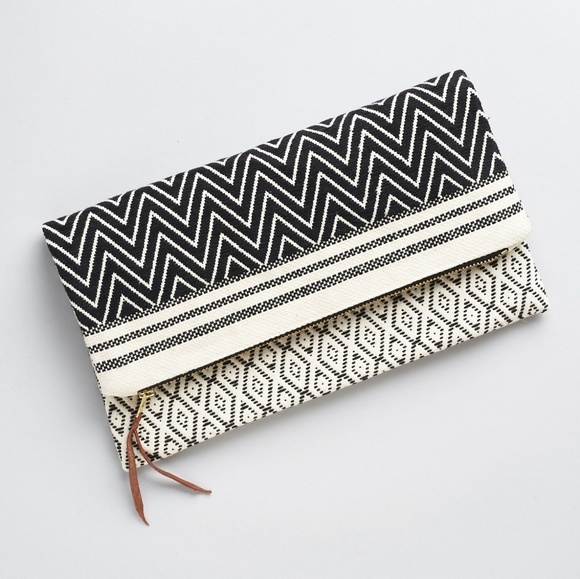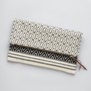 Neutral shades, intricately handwoven to perfection, to create the foldover brocade clutch with a unique mix of contrasting patterns with reversible options. 100% handwoven cotton; 11.5"W × 11.5"H; zipper closure; reversible; made in India.