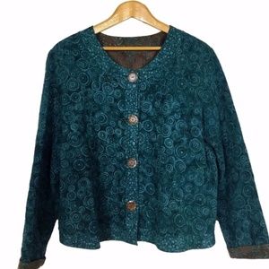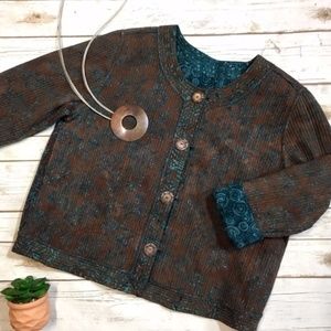 Quilted teal and brown reversible boho jacket. This is so cool and versatile because you can wear it inside out. Has buttons down the front. Because it’s reversible, there are no tags. If you like Chico’s jackets, this one is for you! Material is most likely cotton and I would guess at a M/L size but please refer to the measurements. Measures about 23 inches across from armpit to armpit and 22.5 inches in length; sleeves are about 24 inches long. B10