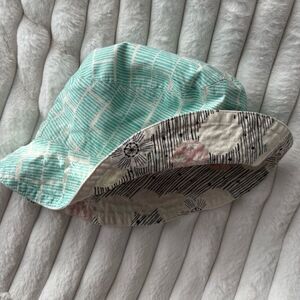 Stay stylish and sun-safe with this reversible bucket hat, featuring two fun designs in one. One side showcases a soft cream base with pastel floral prints and black line detailing, while the reverse offers a fresh teal and white grid pattern. Lightweight, breathable, and perfect for spring and summer adventures. Gently worn with no flaws. Brim width: Approx. 2.5". Head circumference: Approx. 22.25" (adult size).
