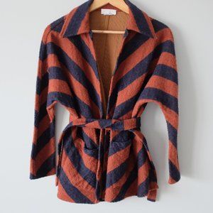 Reversible swing jacket features chevron stripes in a perfect navy and camel color combination, inner and outer patch pockets, and an optional tie belt. Narrow sleeves and a wide swing-y body looks great open or belted.