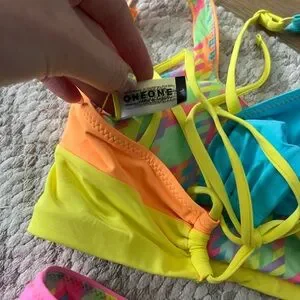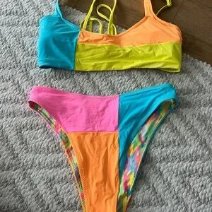 Vibrant colorblock bikini set with a mix of orange, yellow, blue, and pink. Perfect for a bold beach look.