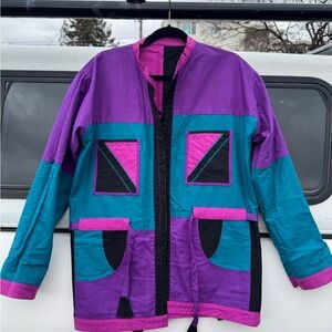 Vibrant vintage patchwork jacket with pink, blue, and black panels. Features multiple pockets and a unique design, with buttons to hold up the rolled sleeves. This is a one of a kind piece.