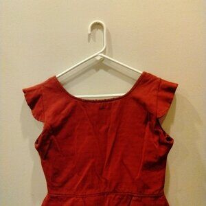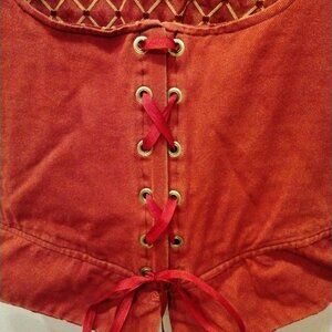 Red corset with gold accents, laced front. There's no tags, I believe this to be handmade. I'd guess it's a medium fit. I'm 5'3 and 140lbs and it's a little big on me, but it's close to fitting (possibly for a slightly bustier gal than me).