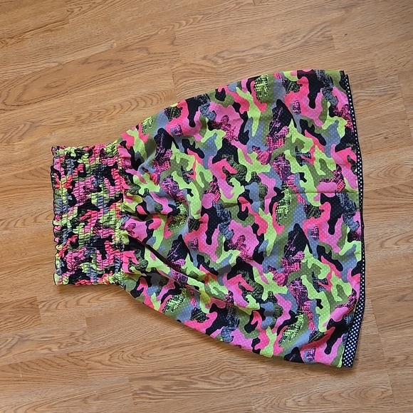Camo print on one side and black with white polka dots on the other. Elastic around the top