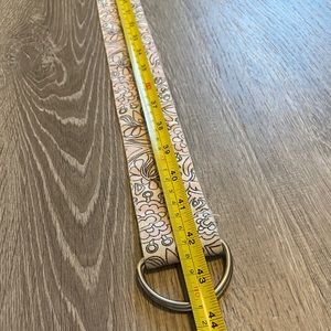 Woman’s reversible D-ring belt. Cloth material, with pink, black, and cream pattern design on one side and bright green on the other side. Woman’s size S/M. The belt measures 43 1/2 inches from tip of belt to the end of d-ring