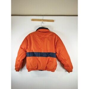 This vintage Pelle Pelle jacket is a reversible biker style piece made of nylon and leather, featuring a racing patch design. It has a zip closure, polyester lining, and a retro 90s-00s look. The jacket is designed for casual wear and is insulated for warmth, making it ideal for the fall season. Made in the U.S.A., it showcases the brand's logo accents and is suitable for motorcycle enthusiasts. There're dye color on the orange side, no flaws other than that