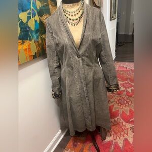 This fabulous duster is reversible and has pockets on both sides. It’s more fitted at the top than it appears in the picture. It’s comfortable. It can be worn with a dress or leather spanx and boots! It’s a statement piece! It’s a small but a little roomy in the arms so it’s not super small. I’m 5’4 130 pounds, breast 34D and I can button it. I bought at an upscale boutique, but do not remember the brand. It’s an olive and one side is corduroy, and floral side is a cotton silk feel.