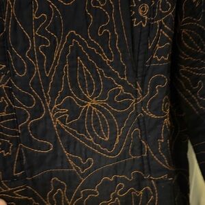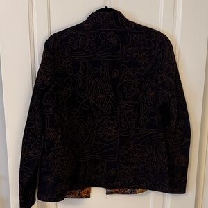 Stylish jacket with intricate floral pattern embroidery. Fully reversible with pockets. Global style. Perfect for adding a touch of elegance to any outfit. No size tag please see chest measurement in photo.
