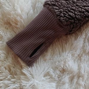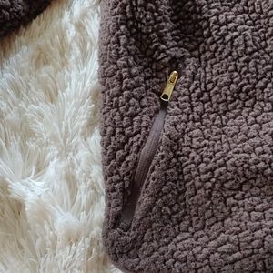 4 pockets total. Fleece side has gold zippered pockets and the regular fabric side has regular open pockets. Wear is as pictured. Thick material all over and has thumb holes. No tag indicating brand or size. Just a JJ on the zipper handle.