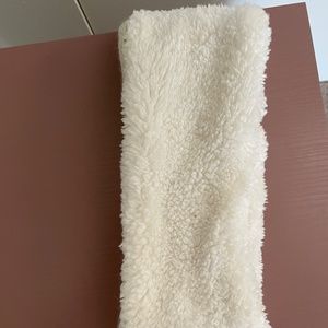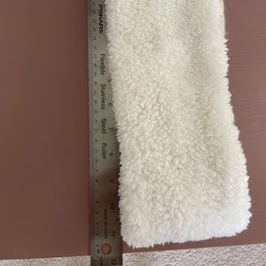 Reversible Fleece Knit Winter Headband from Unknown Brand. One side is cream-colored and braided knit, other side is white fluffy fleece. One size fits most. Headband is about 11 inches long. Perfect for winter activities like skiing, snowboarding, ice-skating!
