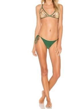Flattering green triangle bikini with contrasting printed trim. Adjustable tie straps for a customizable fit. Lightweight, quick-dry fabric for easy wear at the beach or pool. Classic green color pairs well with seasonal accessories.