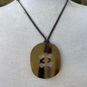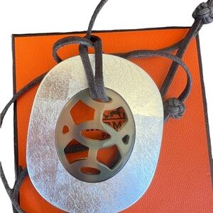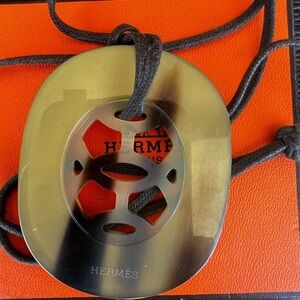 Unique reversible buffalo horn Lift Hermes necklace. Inspired by ironwork, the design is two H’s intertwined. One side features a lacquered brown buffalo horn and the opposite side is a intricate shiny silver design. The necklace features an adjustable waxed chord and comes in original Hermes package