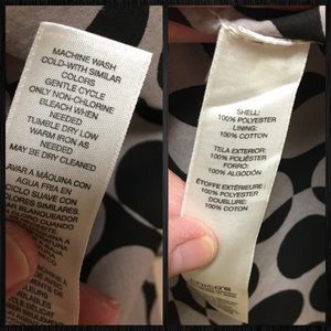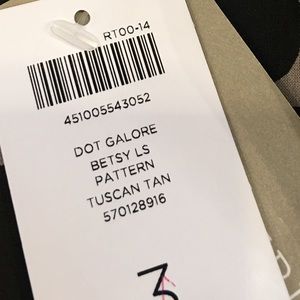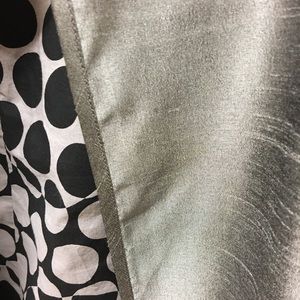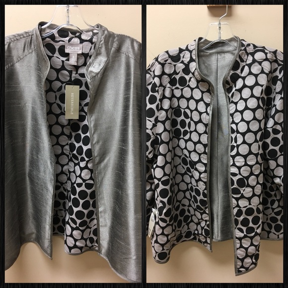 A tan (metallic like on one side) reversible jacket. Light weight and versatile. Shoulder to hem 25” and in sleeve 14”. Small slits at end of sleeves.