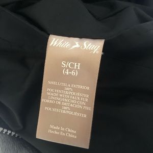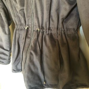 This jacket is awesome! It is reversible. The black side has a sturdy swishy nylon feel that makes it water resistant. The gray side is furry and SO soft and cozy. There are pockets for both sides and a toggle drawstring waist to accentuate. Hoodie as well. Used like new.