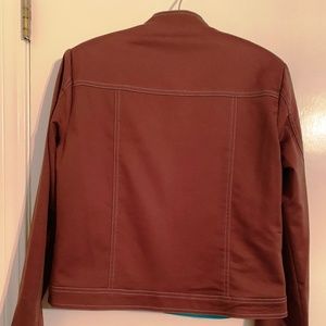 Brown and Aqua Green reversible jacket. Zip front, Aqua side has brown top sticking, brown side has white top stitching.