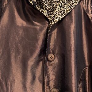 Stylish reversible trench coat featuring a bold leopard print on one side and a solid bronze/brown satin-look finish on the other. Two looks in one statement piece ✨