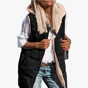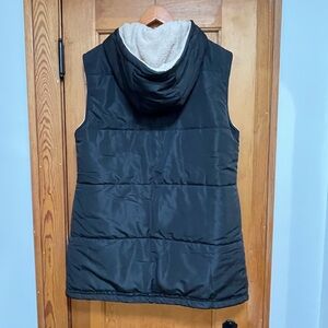 Black nylon vest with Sherpa on the inside. Reversible. Amazon recommend a Medium based off my usual orders. I should have purchased the Small. It runs true to size. Medium fits 8-10. Worn 1x. Smoke free, pet free home