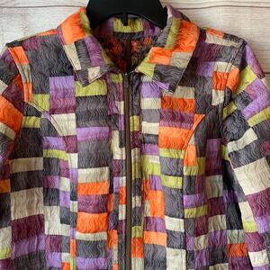 Multicolored reversible jacket with full zipper front and collar. This jacket has a patchwork color block side with gray, orange, green, purple, and white blocks. The reverse side is a floral mosaic pattern. The material is a lightweight quilt-like design. It is pre-owned and in great condition.