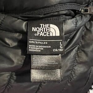 Reversible, one side is a puffer material and the other side is a soft osito-like fleece/faux fur with a subtle swirled pattern