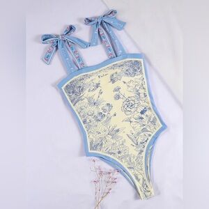 Reversible one-piece swimsuit. Can be used both sides, one side colorful floral print and the other a sketch floral print. High cut, tie shoulder straps, cheeky swimsuit