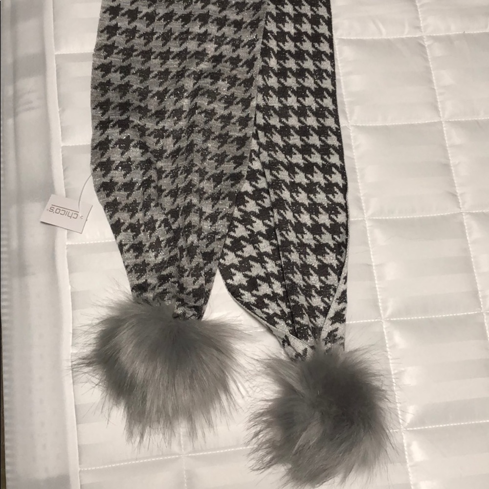 Reversible pattern scarf with shiny threads incorporated and cute fluffy pom poms at the end perfect for spicing up any winter outfits.