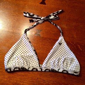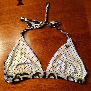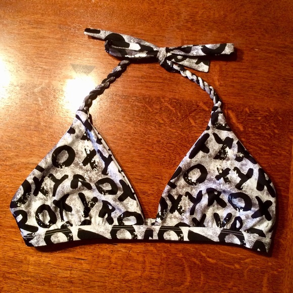 Super cute reversible Roxy bikini top. Black, grey and metallic silver with Roxy printed on one side and black/white polka dots on the other. Hook back closure with 1 adjustment. Top ties behind the neck. No tag but per measurement on Roxy site it is a medium. Under bust measures approx. 31 inches. Bikini top has been worn 1-2 times but is in excellent condition.