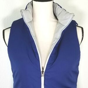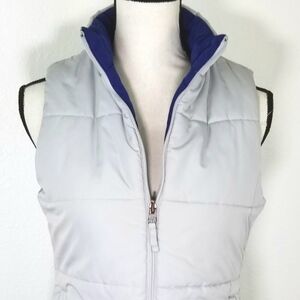 Reversible Royal Blue & Gray Zip-Up Puffer Jacket, size S. Does not have tags, so please note measurements. I believe this is a size Small. Has pockets when worn on both sides. Like new condition.