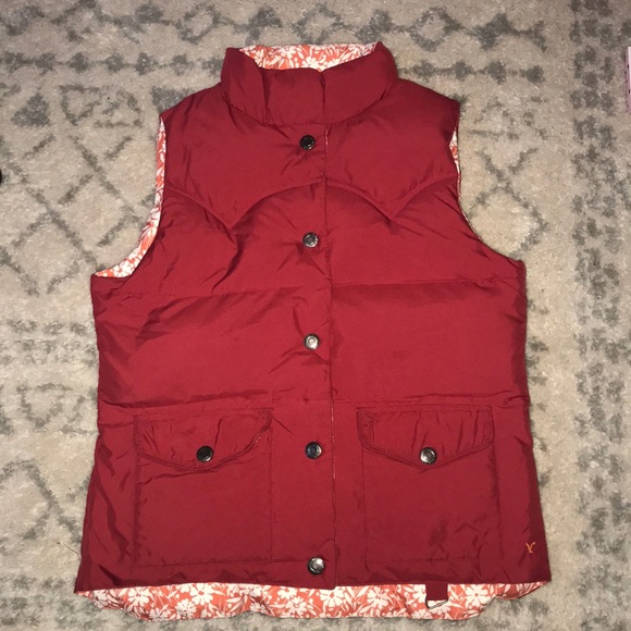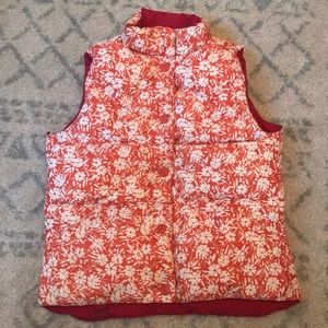 Puffy reversible vest. One side is all red with black buttons and the other side is a orange and white floral print with orange buttons. Both sides have pockets.