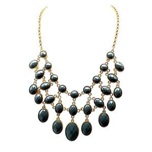 This vintage-inspired bib necklace features elegantly layered faceted stones set in a gold-tone chain. It is a timeless accessory that evokes classic sophistication.