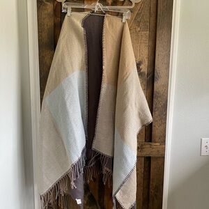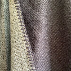 I bought this a couple years ago and never wore it. It sat in my closet and I forgot about it. Now I’m moving to a warm climate and no longer need it. It does have a couple flaws as pictured (stitching and a couple small snags). I don’t believe the stitching would be hard to fix. It is beautiful and reversible. Plum colored on one side and gray and tan on the other.