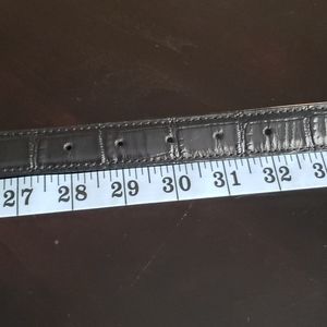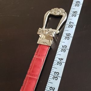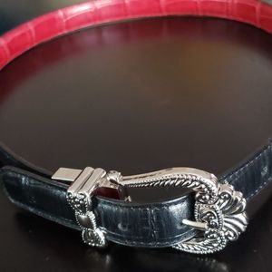 Black and red reversible leather belt with bow on buckle. Inside circumference when fastened to first hole is 33". That would be the largest size or any waist under 33".
