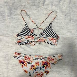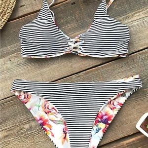 2 piece swim suit. Reversible floral and stripes. Size medium women’s. Wore twice. Top is too small for me (DD).