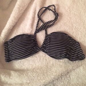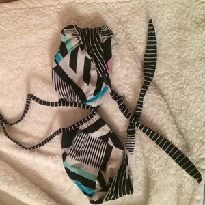 Size medium reversible bikini top. Fits A, B and C cups. Black and white striped pattern on one side and a multicolored pattern on the other. Super cute, lightly worn, great condition. No fading or tears. Built in padding. Bought for $45 at Macy's. Other Tags: swimsuit, cheap, bathing suit.