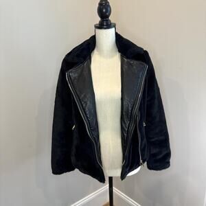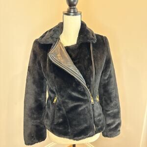 black faux fur, reversible jacket, gold zipper, winter coat, plush texture, statement outerwear, cozy, black outerwear, fur effect, edgy style