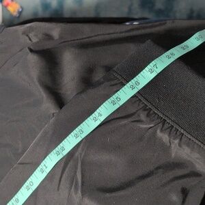 satin black one side and microfiber matte black other side. Soft lined, warm, classy, & thin.