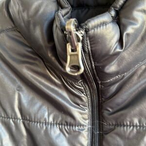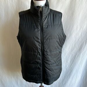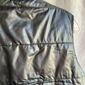 Reversible black puffer vest. Matte on one side and shiny on the other. No brand or care labels due to reversibility but can easily machine wash in cold. Good preowned condition. Zipper pull flips to operate on both sides. Guessing at size L; see measurements below.