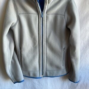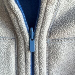 Reversible blue/gray fleece jacket. Medium blue on one side and light gray on the other. It’s like getting two jackets for one price! Two front zippers that reach the same destination regardless of which side faces out. No labels due to reversibility but can easily machine wash in cold. Guessing at size M but see measurements below.