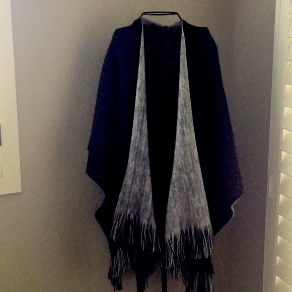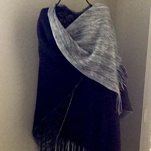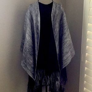 Super soft black reversible cap. Fringed bottom. Black on one side, gray on other. Great for traveling on planes, napping, etc. Can be worn like a scarf multiple ways. Super cute!