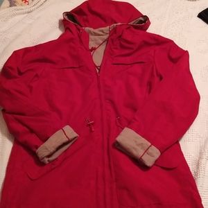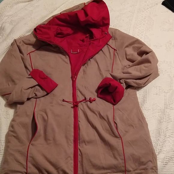 Two looks in one garment! Camel side includes decorative piping. Maroon side is water repellant, camel in that mode is soft against your skin. Medium weight, I would say a 40° jacket, as the coldest. No tag due to its reversible nature, I am listing it as medium, see my measurements. (B76)