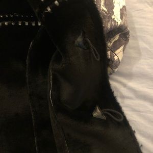 Awesome vintage reversible coat/jacket. Faux fur on one side & suede like leather on other with incredible European pictures. Stitched in places with leather “look” stitches. Sleeves can be rolled up to show inside material of either side on outside. Closes with either a zipper (print side) or toggle (fur side). Size lg. NWOT