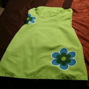 Light green,dark green ,baby blue, blue,&white the other side of the dress is light green with two flowers on it. Zips and ties in the back. Very cute summer dress