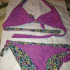 Floral on one side polka dot on the other.. I only wore it once as a last minute purchase but the top was too small I am a DD.. Very good condition, super soft comfy and cute
